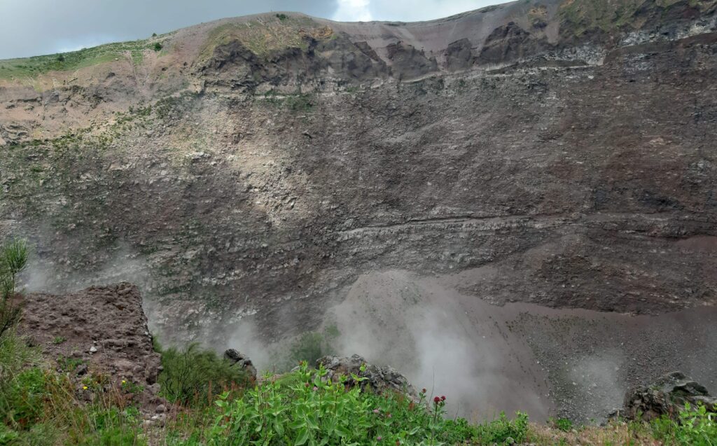 In cima il cratere ha un diametro di 8 km ed è sigillato da un tappo di ceneri piroclastiche e polveri che rappresenta il fascino e il timore di vivere a contatto con un ospite in grado di ribollire e scoperchiare tonnellate di sedimenti assieme alle non frequenti gittate laviche. Come nel 1631 quando l’eruzione “sub-pliniana” fece quasi 5000 morti.
