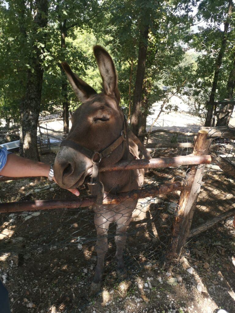 L’arrivo a Montella, dopo oltre 90 minuti di viaggio per i pochissimi chilometri percorsi, ha evocato il fascino concettuale del “féstina lente”, apparente ossimoro latino: quell’affréttati lentamente del quale non siamo più capaci nel turbinio della nostra spasmodica quotidianità. Solo il tempo del trasbordo e dei ringraziamenti agli appassionati volontari di InLocoMotivi ed eccoci giunti, al cospetto di Gilberto Soriano (col suo fedelissimo e mansueto… attendente Dadà, l’asinello di casa) patron del bioparco di fattoria Rosabella che sorge a valle del Monte Accellica sviluppando lungo i rivoli sorgenti del fiume Calore.