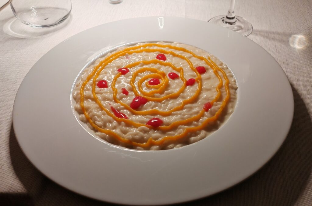 Risotto allo spumante con crema di zucca e olio al melograno