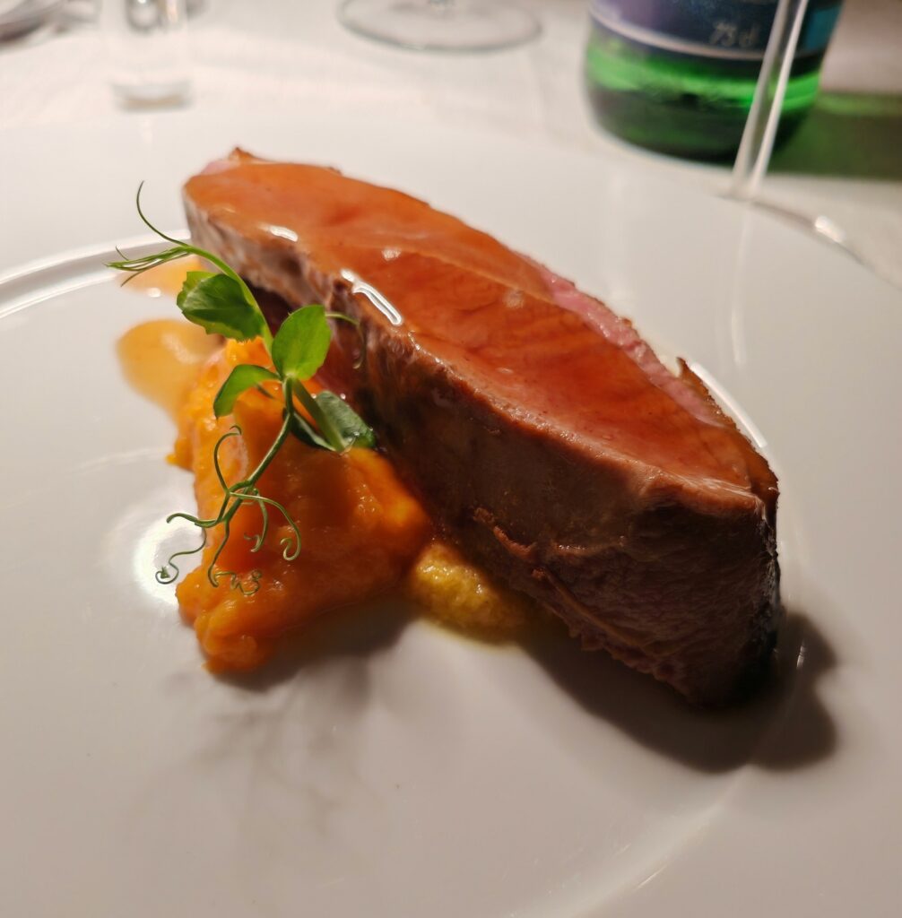 Petto di Anatra, salsa di Cachi e zenzero e purè di zucca
