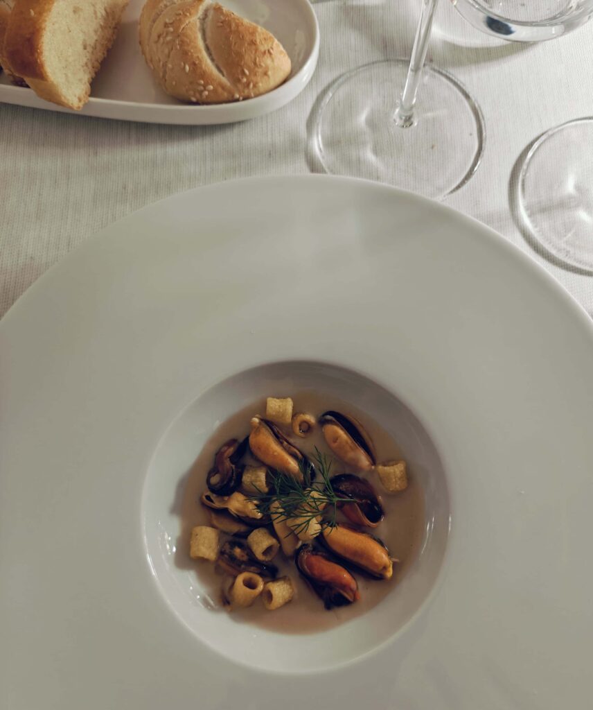 Impepata di Cozze su Crema di Fagioli Cannelini e ditalini croccanti