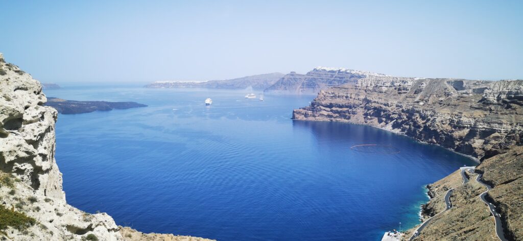 Salendo i tornanti inscritti nelle pareti verticali della caldera, dal porto dell’isola di Santorini, Athinios si arriva alla fine della strada a un bivio . A sinistra le indicazioni per il capoluogo Thira mentre subito a destra, si trova la sede della cantina Venetsanos.